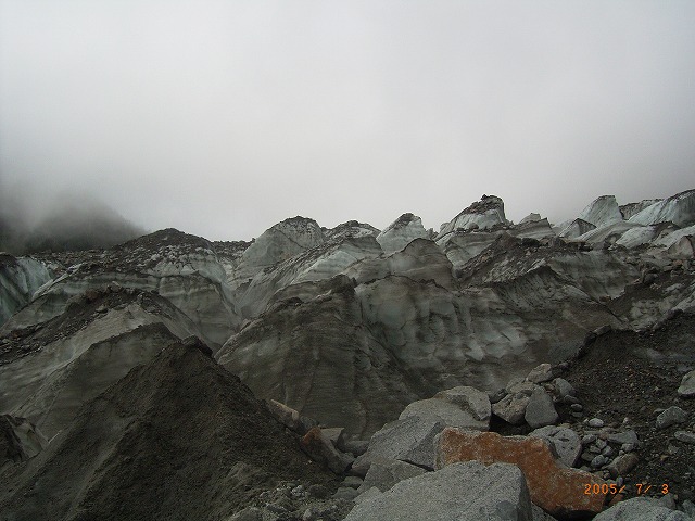 写真5は、徒歩終点の氷川景観台から、実際の氷河に足を入れて上り、氷河を撮ったものです。下に見える桃色のロープは、これより先が立入り禁止のためのものです。実際は、多くの人がこれを越えて前進し、記念写真に暇がありません。ただ、そこには警備員が一人いてそれ以上の前進を止めていました。この頃には雲が出てきて後方の山は雲に隠れました。