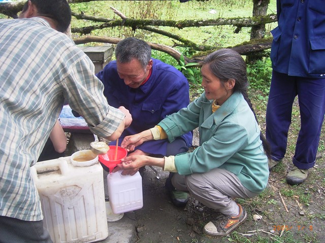 写真1は、奥の一号営地(キャンプ場)で養蜂人から蜂蜜を直接買い求めたときのものです。中央の男性が養蜂人で、手伝っているのは、ボートのための我々の換え着を運搬する人です。1斤(500gm)4元です。