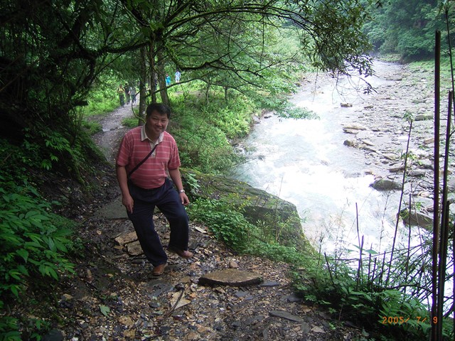 写真2は、渓谷沿いの道を帰るところで、日本語学科主任劉教授を撮ったものです。
