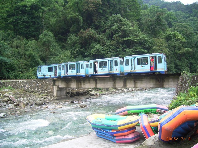 最後の写真3は、三江のもう一つの目玉、軽便鉄道(1mゲージ)です。ホテル前から川下り出発点まで、約3㎞余りです。機関車はディーゼルです。3人掛けとなっています。写真の車両とは別に無蓋客車もあります。この写真の右下に写っているのが川下り用の2人乗りゴムボートです。橋の下の様子で流れぶりも分かると思います。