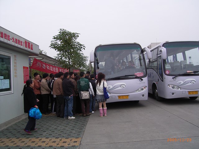 しかし、スクールバスでは市内中心などに行くには不便です。何といっても1時間に1本ほどしか運行していないからです。それに市内中心などに行く交大路(西門)にある西南交通大学前バス停まで徒歩で10分近く歩く必要があります(この点は本校の学生も同様です)。この点が改善されました。この秋から栄軍校と九里堤公文站を結ぶ362路の公共バスの運行が始まったからです。362路は犀浦キャンパス正門前にバス停を設けました。ここから九里堤公文站まで10のバス停があり、20分あまりで結んでいます。料金は1元です。九里堤公文站は市内バスターミナルで、ここより市内中心部の塩市口・東大街へ行く56路や総府街へ行く3路が始発としています。その他各方面へ行くバスがここを始発としたり通ったりしています。例えば、塩市口を通り新南門汽車站(市外バスターミナル)に行く48路もここに止まります。なお、ここから西南交通大学前までは三つ目です。