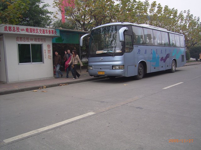 最後に、本校と峨眉キャンパス間のスクールバスですが、朝8時と夕方17時との日に2回運行されています。料金は25元です。成都・楽山市間を高速道路の利用で、約3時間あまりで結んでいます。週末になると峨眉キャンパスからの成都市へのショッピングなどの利用の便などをもあり、土日には14時発の便があります。写真3が本校のそのバス停です。以上の写真に見るように、スクールバスには荷物室を有したエアコン付の観光用タイプの中型バスが用いられています。