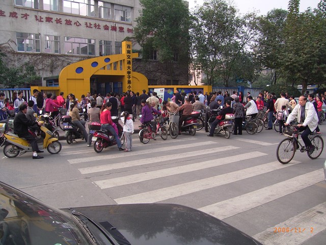 写真はその下校時のものです。写真1に見るように、校門前には多くの自転車(実は、写真に見える多くは電動スクーターです。電動自転車の発展したもので、成都では一般化しています。時速20キロ以下となっているはずですが、それ以上出るのもあり、歩行者にとっては注意すべきものです)が集まり、父兄が生徒を待っています。母親ばかりでなく、父親も多いことがお分かりでしょうか。中国では、このように生徒の保護者(両親だけでなく祖父母も)が送迎をするのは都市では普通のことなのです。