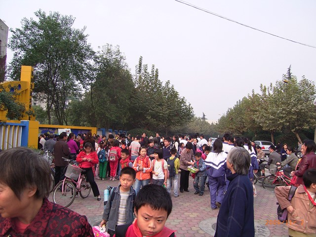 8時半登校で、朝礼などの後、8時45分に1時限目(40分授業)が始まり午前中4時限で、12時から14時までが昼休みとなり、多くの生徒は自宅に戻り昼食を取ります。午後は14時登校で、14時10分に5時限目が始まり、15時40分に6時限目の授業が終了し、下校時となります。もちろん、その後も課外活動する生徒もおります。以上が小学校の1日で、この昼休み時と下校時に保護者の校門前でのお迎えがあり、写真のような風景を見せるわけです。