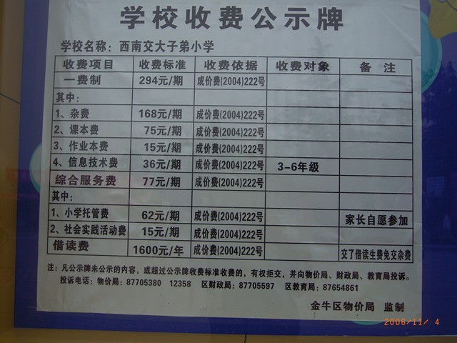 最後に、写真4ですが、これは「学校收費」、すなわち学費などの経費を示したものです。校門脇に掲示されています。国家の基準に基づいて、成都市金牛区の定めた標準経費です。学期ごとに学費は294元(雑費168元・教科書代75元・テキスト代15元・情報技術費〔いわゆるコンピューター教育、3~6年生〕36元)、綜合服務費77元(委託管理費〔いわゆる、昼休みなどで学校が生徒を保育すること、保護者の自由意志〕62元・社会実践活動費15元)です。2学期制ですから、委託保育すると、年に742元となります。なお、最後の「借読費」年1600元とは、他の小学校の生徒を受け入れる場合の費用です。本来的には居住地により学区が定まっていますが、優良校には学区外からの希望者が集ります。