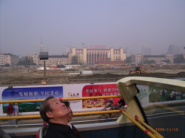 写真4は成都市のへそともいう天府広場です。中央右に小さく白く見えるのが毛沢東像です。現在、広場はご覧のように工事中です。これは1号地下鉄線の駅(将来、2号線とのターミナルに)と地下商店街建設のものです。車内には若い女性の車掌が乗車しており、車内案内として、バス停ごとに観光案内をしており(もちろん中国語)、それにバス停の英語録音案内もあり(最近、一部の市内路線ではバス停の英語録音案内が)、観光路線であることをアピールしています。