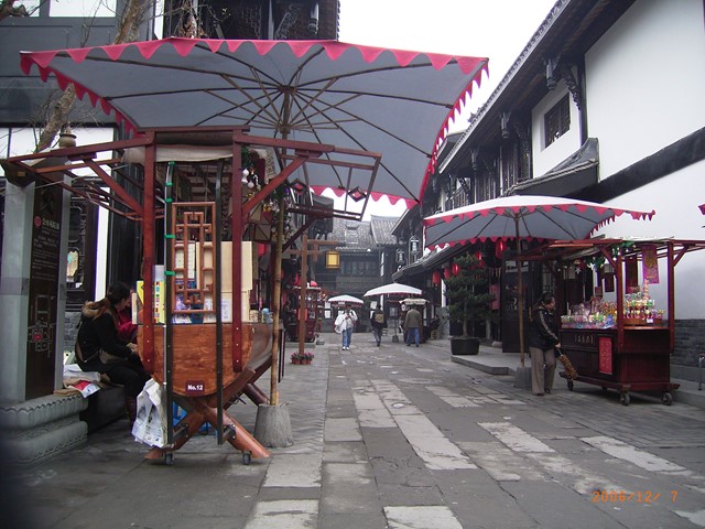 写真2は南岳巷の中央から西へと撮ったものです。この道を東へ歩くと東岳巷に突き当たります。その東には工芸品の店が並びます。道を左に取り、東岳巷を北に進むと、文殊院街から続く五岳宮街に突き当たります。東岳巷から右(東)に五岳宮街を少し進むと十字路に出ます。左(北)へ頭福街へと道をとって歩くと、丁字路に突き当たります。そこを右(東)に曲がると、「消え去る木造民家―成都雑感〔5〕―」(2005年6月11日付)で紹介した西珠市街です。