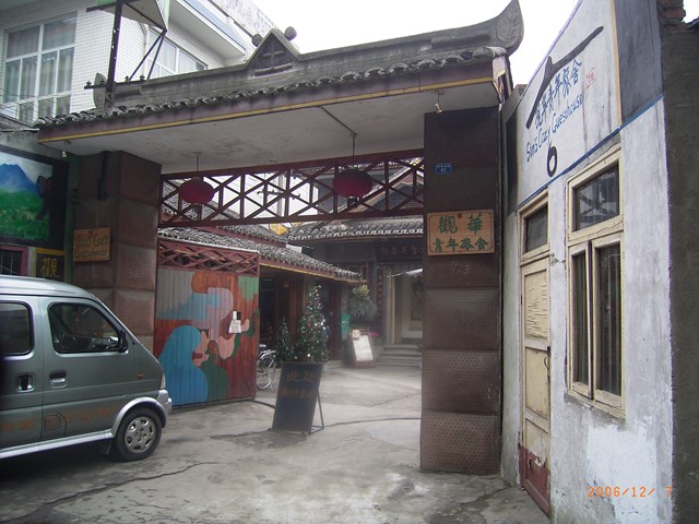西珠市街を進むと、写真3の観華青年旅舎(http://www.gogosc.com/house_jp.asp)が道路の左(北)にあります。大通りである北大街の手前です。ここはシンガポール人・日本人夫妻が2004年に始めたゲストハウスです。写真に見るように、旧来の民家を改造してゲストハウスにしたものです。宿泊費は15元(ドミトリー)から200元(ファミリータイプ・ツィン)となっています。なお、写真の入口左に見えるのが、併設されている旅行社のデスクで、チベット行きをはじめ各種のツァーや切符手配が出来ますし、ゲストハウスの日本語が分かる人が必要に応じ通訳をしてくれます。