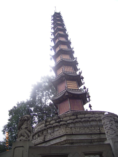 ところで、文殊院(入場料5元)は唐代大業年間(605~17年)に創建されたと伝える成都でもっとも古い古刹です。明末に焼失破壊され、清代前期の1697(康煕36)年に再建され、その後増改築されて、現在の規模になったのは清後期の19世紀前期です。敷地面積は5.7ha強と広く、境内は都会の真ん中にもかかわらず静粛です。写真6は1991年に建立された高さ21mの鉄製の千仏和平塔です。名前の通り外壁に1000体の仏像がはめられています。