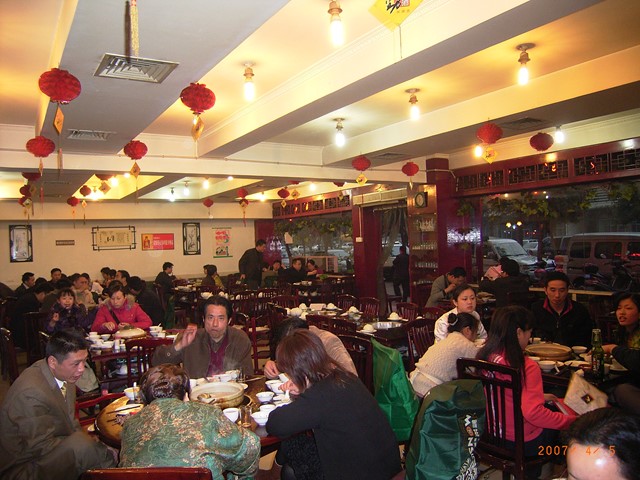 写真1はすでに調理済みの鴨1羽の入った土鍋を温めているところです。ご覧のように、まる1羽の鴨が中央に鎮座し、椎茸などのキノコ類が見えますが、これ以外にこの店のは大根(蘿卜)・タケノコも入っています。まず温まったら、スープを小椀にとって飲みます。そして、鴨肉にかかります。箸で骨ごと簡単にばらせますから、皿に取り、肉をつけだれ(ごま油に適宜青ネギの刻みを)に付けて食します。なお、この鍋はビールよりも白酒の方がよいかと思います。