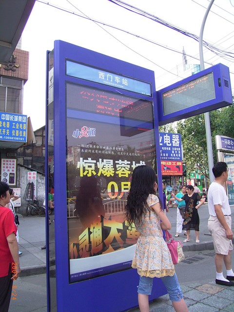 写真1は西門車站でのこの設備の全景です。最上部に「西門車站」と停留所名があり、その下が電光表示となって、写真では一部の電光しか見えませんが、「公文電子站牌 測試中」と二段に表示されています(肉眼では問題なく見えます)。これは英語表示でも出ます。この他、月日時間表示もされます。下部はご覧のように広告スペースです。