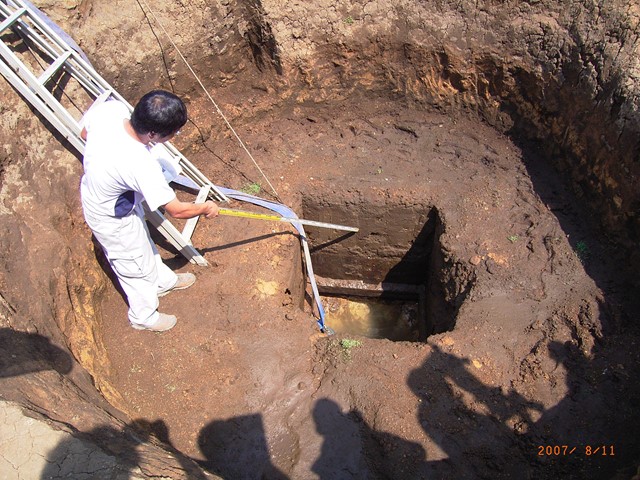 写真2はその大井戸跡(14号井戸)で、秋山氏が説明しているところです。本井戸跡は外径約4mの円形の中央に、さらに約1mの方形に粘土層まで掘り、この方形を木枠(写真で、方形の下部に見えます)で押さえて、各面を5枚の立て板で覆い、この木枠と立て板を何段(7段と推定)か重ね、井戸を確保した構造となっており、他の掘切の井戸(約1m程度)とは構造も大きさも段違いで、まさしく館の中心井戸と推定されるものです。現在でも井戸跡地には地下水が流れ、このため木枠などが朽ちることなく保存されていたわけです。なお、井戸内からは青磁片などが出土しています。