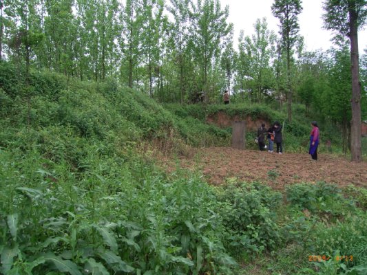 さて、碑の所に、右に入る小道があります。この道を歩いて少し行ったところに右側に民家への上り道があります。実はこの民家はちょうど城壁遺址上にあるのです。この家のお婆さんが親切に案内してくれました。この庭先を進んだところが「全則図」の赤で示してあるところで、ここは城壁遺址を開削発掘し調査した地点です。現在ではもちろん調査地層は埋め戻してあります。写真2は、開削発掘調査地点を城壁外側から撮ったものです。ここに「宝墩古泉」碑も立っています。なお、写真の右に小さく見えるのがお婆さんです。