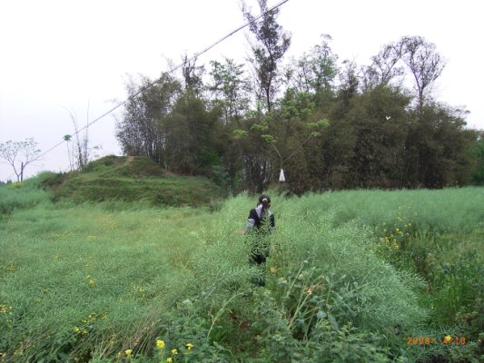 この地点から前方を見ると、丘林が見えます。その丘林へと向かう途上で撮ったのが写真3です。この丘は「全則図」の赤印から斜め右下に当たります。すなわち、南側城壁の現存東端部分です。両側の畑は菜種を栽培しており、四川盆地一帯が冬菜種・夏稲作の二毛作が通例であることをこの村も示しています。3月に訪れていれば、黄色の菜の花で華やいでいたことでしょう。なお、前方を行く女の子はお婆さんのお孫さんで、小学生ですが、しっかりと宝墩遺跡のことを把握しており、案内をしてくれました。やはり地元の人は本遺跡を誇りに思っているようです。