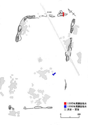宝墩遺跡は、1996年、成都市文物考古工作隊・四川聯合大学(現四川大学)考古教研室・早稲田大学長江流域文化調査隊の日中合同の発掘調査が行われました。これにより、北東から南西方向に1100m・南東から北西方向に600mの長方形の城壁に囲まれた遺跡であり、最大高8mの城壁を持ち、面積が66万㎡に達する大きな遺跡であることが分かりました。そして、これ以降の調査も含め、現在では本遺跡がBC2500年前、すなわち4500年前の遺跡であることが解明されました。下の〔龍馬古城宝墩遺跡全測図〕は合同発掘により作成された本遺跡の現地測定図で、城壁遺址の現存状態を示しています。なお、図の右側に斜めに走っているのが用水路沿いの道です。そして、上部の城壁遺址を示したところに、「用水路」と書かれている辺りに写真1の碑が立っています。
