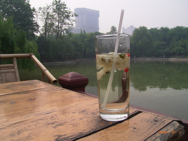 ジュピターさん、こんばんは。菊花茶と檸檬茶だけがガラスコップ入で、他の茶は本来の茶碗入です。いずれの茶もポットから湯を注いで飲みます。この茶館では茶とともにポットを渡され、これを茶とともに持って行き、席について、自分で湯を注いで喫します。以後の継ぎ足しも自分でします。ポットの湯がなくなったら、係員に告げると湯の入ったポットを持ってきてくれます。この点、係員がポットを持っていて、注いで回る他の茶館と異なります。四川省は中国有数の茶の産地です。かつては最大の生産地でしたが。「碧譚飄雪」(成都市新津県)はその代表的銘柄です。庶民的な野外の茶館にはありませんが、高級茶として知られているのに、峨眉山の「竹茗香」があります。人民公園は、鶴鳴茶社の前に広がっている池を中心に、この周辺や南側が中国式の庭園になっています。北の大門を入ったところから、右に記念塔方面は円形のダンス広場がなどがあり、近代的ですが。