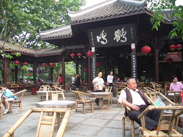 成都市の風物として今も市内各所にある茶館が本公園にももちろんあります。そこで、本公園の茶館「鶴鳴茶社」を紹介します。本茶社は公園が1914年に拡大された際に開設されたもので90年を超す伝統ある茶館です。正大門を入り、道を左(東)に取ると直ぐです。写真1は「鶴鳴」の額を掲げた本茶社の中心です。ここで茶などの販売をしています。
