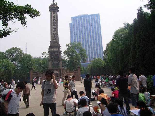 最後の写真4は「辛亥秋保路死事紀念碑」です。鉄道利権を欧米列国に割譲したことに対する民衆の反対闘争の犠牲(1911年秋)を記念して、1912年4月、建てられたのが本碑です。この闘争は辛亥革命に呼応して、四川省政府が成立したきっかけとなった事件として、四川省の近代史上で忘れることのできない出来事なのです。碑の高さは31.85mです。なお、写真をご覧のように、手前にいるのは本碑を写生している小学生たちです。先生に引率されて写生していました。本碑は1988年に中国の全国文物重点保護単位となり、またその後「愛国教育基地」に指定されましたから、小学生たちの教育の一環としての写生対象となったのでしょう。