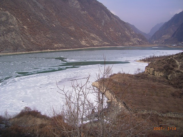 ところで、成都市は歴史上に被害を受けるような大きな地震にみまわれた記録はありません。それで、四川省には地震がないと、中国人一般には思われています。しかし、近代に入り、1933年8月25日、同自治州茂県畳溪鎮(成都より北北東約150km)を震源とする、M7.5の地震が発生し、同地の多くの集落が大山崩れにより陥没全滅し、1万人に達するといわれる死者を出した大地震がありました。この時の地震で岷江がせき止められ、湖が生まれ、畳溪海子という九寨溝への途上の観光地となっています(なお、下の写真は昨年1月に九寨溝への途上で撮った畳溪海子です)。このように、四川省西部の山岳地帯は局地型地震が発生するのです。今回も、1933年の地震と同系統のものと考えます。