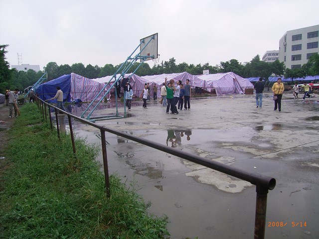 昼食がてら、西南交通大学九里堤キャンパスを歩きました。本日も大学は休講です。昨日は本キャンパスは被害を受けていないと記しましたが、実は、20階建ての中心教学楼の壁の一部に亀裂が入ったそうです。このため建築学科などの専門家が点検に入っているそうです。これらの点検が終わり安全が確認されるまでは休講ということになります。また、郊外の犀浦キャンパスの校舎では外部はそれほどでもありませんが、内部では天井の落下や壁剥離、それに亀裂も生じたそうで、被害状況は本キャンパスよりひどく、修理の必要があり、このため講義再開が本キャンパスより遅れることになります。なお、私のいる鏡湖賓館別館(4階建て)は壁漆喰などの剥がれなどもまったく見えず、被害は受けていません。