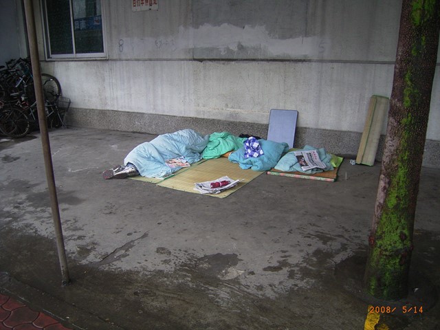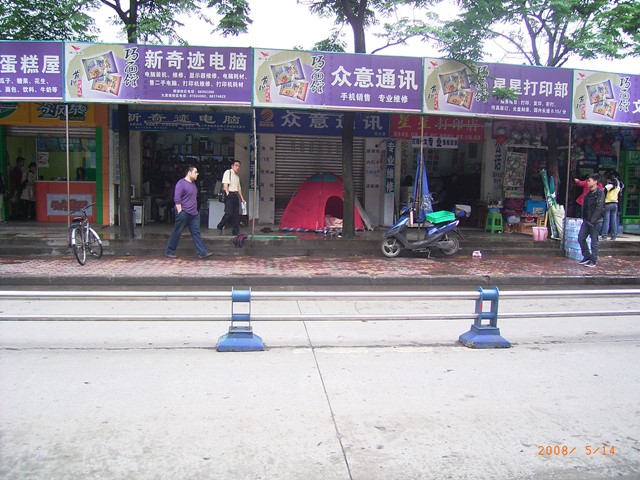 写真2は、北門への道の歩道上に避難した学生です。昨日はこの歩道上に多数の避難民がゴザを引いていました、今日はごくわずかでした。ここは商店街に当り、アーケードがかかり雨よけにちょうどいい場所です。