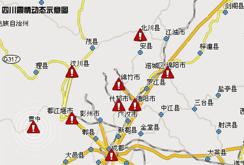 最後に、『新華網』「汶川地震抗震抗災特別報道」(http://www.xinhuanet.com/politics/kzjz/)上の最新(14時現在)の「四川震情動態示意図」を張り込んでおきました。