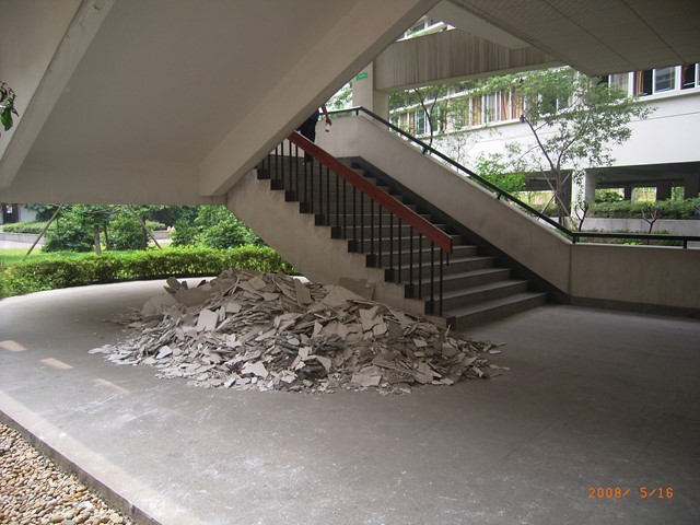 写真2は、1号教学館を入り、中庭にある階段の所です。このゴミは各階で剥離した壁のモルタル・漆喰です。講義再開のため教学の清掃の結果出てきたものでしょう。随所で剥離が起きたことが分かります。
