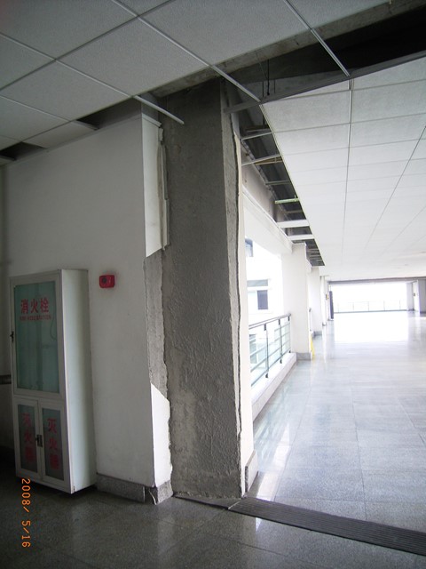 次いで、写真4は、同じく最上階の5階部分です。両者をご覧のように、回廊の柱・校舎の接合部分で、2階では回廊側の柱のモルタルが見事に剥離落下してしまい、5階では剥離で両者の接合に隙間が出来外が見える状態になっています。また、両者とも天井版が相当破損・落下したことが分かります。やはり接合部として振動が厳しかったことが分かります。