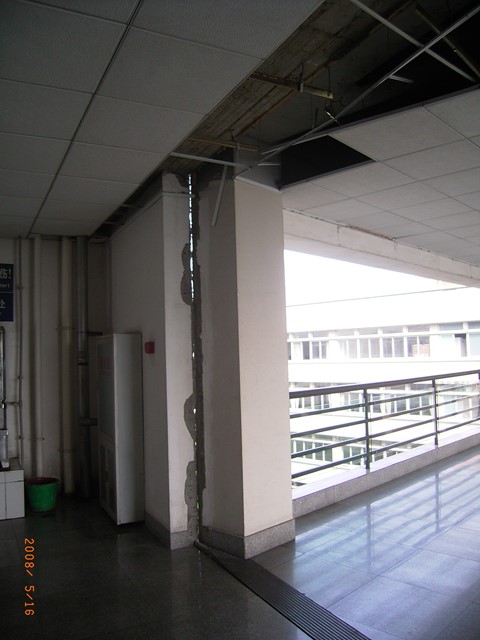 写真でお見せするのは以上です。1号館を見た範囲では写真3・4がもっとも目に付くものでした。階段部などには壁にひび割れが見えましたが、これもモルタル内部止まりでした。廊下の天井の一部に破損が見られますが、教室内は床部(コンクリート)が天井ともなっているので、壁・天井とも破損は見られませんでした。総じていえば、壁の破損は表面部のみで本体に破損はないようです。柱に関しても写真にみる所を除いて、ほかには祖損は見られませんでした。ガラス窓に関してはまったく破損は見られませんでした。こうしてみると、建物本体に打撃を与える被害は被ってはおらず、被害は表面的なもので、軽微といえるでしょう。なお、学生の話では、被害が最も大きいのは昨年に完成したばかりの図書館だそうです。