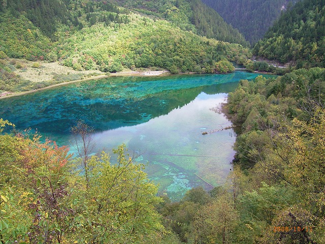 5月12日の四川省汶川大地震では、九寨溝自体はさしたる被害を受けませんでした。しかし、途中経路が震源地域であったため、幹線路である国道213号(成都・蘭州)が甚大な被害を被り、不通となり(9月下旬から小型車両のみようやく時間規制の通行可となりました)、東迂回路(綿陽市・平武県)経由も震災復興を優先するため、バスツァーの募集が停止されています。こんな訳で、現在の九寨溝への経路は九寨黄龍空港を利用した空路が主体となっています(一部、新開発された蘭州からのバスツァー)。このため、例年なら国慶節には日2万5千人以上の観光客が押し寄せるのに、今年は最高で約8千人と少なかったのです。いわば、二度とないほどの観光客の少ない年なのです。