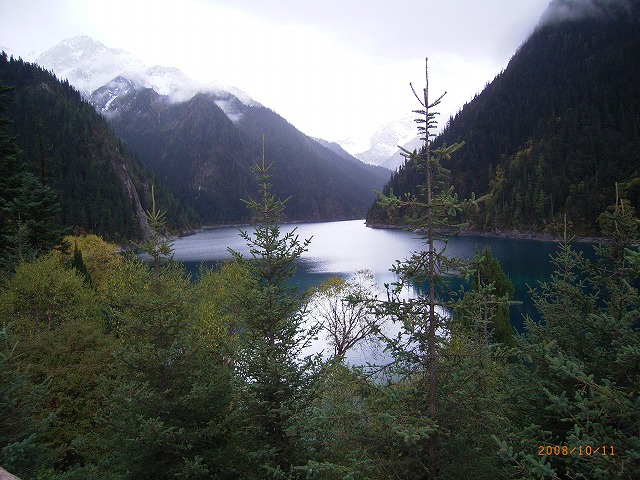 ここからバスに乗り、諾日朗旅游中心(観光センター)に行きます。ここで、長海行のバスに乗り換えます。長海行バス乗り場はセンターの先です。終点の長海で降ります。14時半を回っていました。写真6は長海全景を見たもので、奥の山はすでに雪をかぶっています。