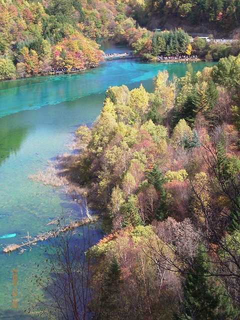 26日(晴) 8時半入溝。バスにて長海(9時半前)。徒歩にて五彩池(10時前)~五彩池上車站(約1km)。バス(季節海は車中)にて鏡海(10時半過ぎ。実は原始森林行に乗ったため)。バスにて犀牛海(11時20分前)。以後は徒歩にて老虎海(12時前、約600m)~樹正瀑布~樹正群海(12時10分過ぎ、約500m弱。昼食)。道路を徒歩で臥龍海~樹正群海(13時、往復約1km強)~遊歩道で臥龍海~火花海(14時前)~双龍海~双龍海上車站(14時10分、約2km)。道路を徒歩にて芦葦海~盆景灘(14時40分過ぎ、約2km半弱)。バスにて出口へ、15時出溝。以上で則渣洼溝景区・樹正溝景区巡りが終了し、九寨溝の全観光を終えました。