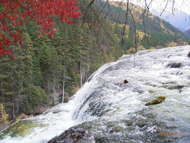 写真5は、珍珠灘が滝(珍珠灘瀑布)となって落ちかかるところを、下る遊歩道からとらえたものです。ちょうどここに紅葉した木がありました。