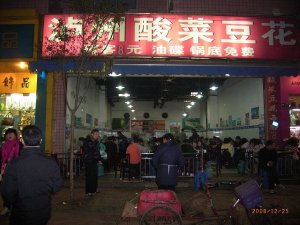 さて、今回行った店は、西南交通大学付近にはこの豆花火鍋のいい店がないので、四川大学付近の店へと遠征しました。ちょうど、夕方のラッシュ時とも重なり、バスで1時間ほどかかりました。これが、写真2に見る、「瀘州酸菜豆花」店です。瀘州とは成都市西南約280kmの長江に接する市です。酸菜とは四川風の漬け物のことで、白菜が一般的です。写真をごらんのように、気取ったレストランではなく、典型的な庶民の食堂といった店構えです。時間は平日の20時くらいですが、ごらんのように客でいっぱいで、流行っている店であることがお分かりでしょう。私たちが着いた18時半頃では、席待ちの行列を作っており、店員に告げて順番を待ちました。店の住所は共和路8号附4号です。行き方は、一環路南一段中間付近(最寄りのバス停は紅瓦寺―12・19・27・34・72・77・92・112路)で、南に紅瓦寺街(角に学府歌城という映画館の入ったビルがあります)に入り直進し、ぶつかった道が共和路ですから、左に曲がり、歩くとすぐです。また、共和路を進むと、太平南街になり、九眼橋に出ます。なお、共和路の東側は四川大学本キャンパスです。