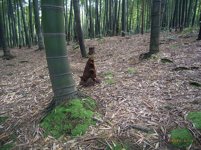 写真2は、長廊の途上で、人面竹への案内の出た道へと左に入り、途上で竹林の中で見た、竹の子です。まさに竹の子のシーズンに入ったことが、手前の竹の子の後方にも何本かの竹の子が見えることでお分かりでしょう。なお、人面竹は道に並んだ露店のお土産屋さんの切れた先にあります。