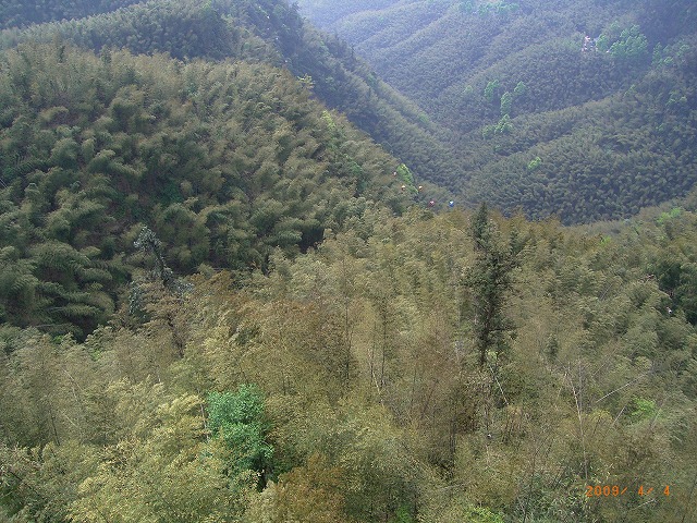 長廊から戻り、ロープウェー乗り場脇の観海楼に上り、観竹海(竹林)を見下ろしたのが、写真3です。まだ竹は青々とはしていませんが、左側の山は全山竹で覆われています。こちら側に長廊は位置しており、この山が風景区の中核なのです。そして、写真中央やや右に小さく青・赤に見えるのがロープウェーの2人乗りゴンドラです。こうして、ロープウェーで帰ってきたのが、16時半過ぎでした。