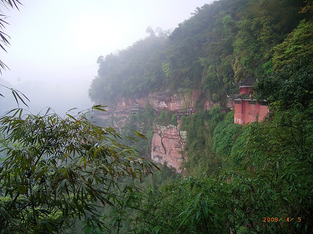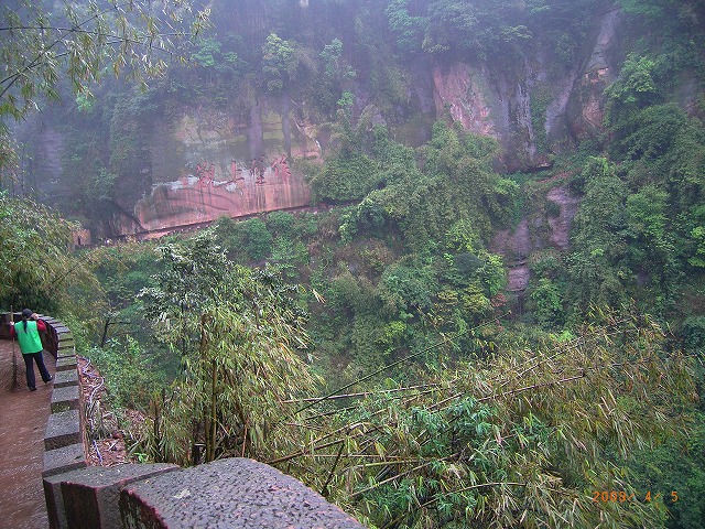 2日目(4月5日)の観光は仙寓洞からはじめました。この日は雨が弱いながらも降っていました。この雨の中、8時6分に下車し、洞へと竹海の中の道を歩きました。10分ほど下ると、絶壁にへばり付いている洞に出ます。これは竹海の南部中央に位置し、明代の摩崖仏が残されているように、古く創設され、仏・道両教の所でしたが、現在は仏教寺院のみとなっています。数百mの絶壁上に、長さ300mに渡っており、この中に大雄宝殿等が設けられていますし、途中に滝(穿飛瀑)がかかっています。写真5は洞の東部から洞主部を望んだものです。
