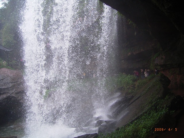 竹海最後の観光地スポットは七彩飛瀑(落魂台)です。ここは竹海最大の滝で、4段に分かれた滝が高度差200mほどを落ちます。12時15分、バスを降り歩きです。広場(八卦)に出て、案内にしたがい道を左に取ります。一段の滝上(回龍橋)を通り、下に降りると、渡し船に出ます。渡船料は4元です。船を降り下ると、二段の滝です。この滝は高さ15m・幅3mほどのものです。写真8がこれですが、見ればお分かりのように、滝の裏側がえぐれてこれが通路となっています。まだ増水期ではないですが、それでも水しぶきを浴びます。この滝は北面していますが、正午になると陽を受けて虹が出るとのことです。さらに進むと、絶壁を落ちる高さ74mの四段の滝が対面した絶壁上から見られます。そして、上っていくと広場に戻ります。以上、広場からは時計回りの周回路です。実は、二段の滝へは広場中央の道から直接下ることもできます。13時10分前にはバスに戻り、全観光が終了です。19時過ぎに成都に帰着しました。