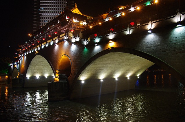 写真3は、九眼橋の西約300mにある安順廊橋を上流西から写したものです。本橋の創建が何時かは不明ですが、マルコ=ポーロの『東方見聞録』にこの橋の記載があり、歴史の古い橋です。現在の橋は2003年に新築されたもので、欄干・橋舗道が石造りで長81m・幅6mです。廊とあるように、橋上に楼閣が建てられており、現在、中華レストランなどが営業しています。ちょうど、この橋の上流で、北からの府河と西からの南河が合流し、合流点直前の府河上に合江橋が架けられています。また、安順廊橋上流南岸には、茶館があり、茶などの各種の飲料が楽しめます。ちなみに、撮影途中で、私は休みを兼ねてビール(ハルビンビール中瓶15元)を頼み、ライトアップした両橋と川辺を見ながらのどを潤しました。