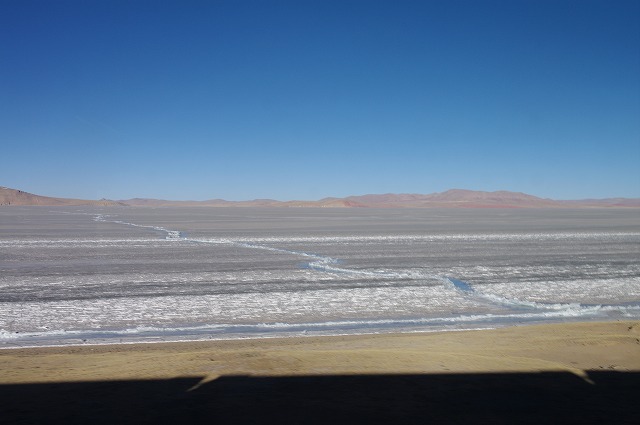 やがて夜が明け、列車は順調に走り続けます。托居駅(西寧から1499km)を視認し、完全にチベット自治区に入ったことを確認しました。こんな関係で、唐古拉駅関係の写真がないのです。そこで、錯那湖を待つことにしました。錯那湖湖畔を鉄道が走るのです。錯那湖は努江(ミャンマーでタンルイン川)の源頭湖で、面積約300平方㎞・海抜4800mです。写真3は凍結した錯那湖です。諏訪湖と同様にお神渡りをしているところを撮ったものです。手前には列車の陰が写しこまれています。すでに10時をかなり過ぎていました。