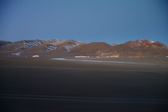 7時半過ぎに外を眺めると、まだ闇の中でした。時刻表から、走行距離を計算して、まだ世界最高海抜の唐古拉駅(海抜5068.63m 西寧から1421km・ゴルムドから591km。駅舎・ホームは進行方向左側)までには時間があると思い、夜が明けるのを待ちました。列車内の電光掲示版で、海抜4900m台後半を示しているので、近づいてきたなと思って、ようやく空に明るみが出ましたが、いっこうに駅を確認できず、海抜表示も下がってきました。写真2はまだ日の出前の明るみが差してきたときに進行方向右側に人家を見出して撮ったものです。8時34分でした。後で気がついたのですが、実はすでに闇の中で唐古拉駅を通過していたのです。時刻表から計算される以上のスピードでココシリ高原を駆け抜けていたのです。