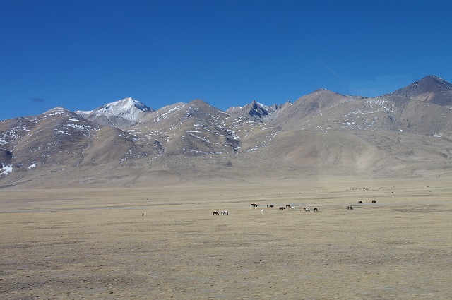 時刻通りに発車した列車は順調に走り少しずつ高度を下げていきます。相変わらずチベット高原の風景が続き、周りの山はこれより数百メートル程度しか高くありません。時に集落が現れ、牧畜のヤクなどの姿も見えます。写真5はその一つで、ヤクの群れです。中央左寄りに群れに離れているのが牧畜人です。時間は14時を回っていましたから、古露駅(西寧から1735km)付近かと思います。
