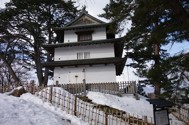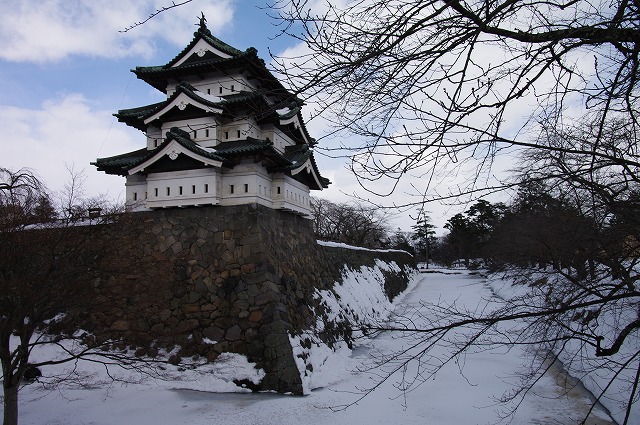 2010年2月1日(月)、青森県弘前市の弘前城を訪れました。弘前城は初代津軽為信・信枚父子により築城され、1611(慶長16)年に信枚が入城し、以後明治時維新に至るまで津軽藩の居城として位置しました。関東以北で江戸時代の天守が現存する唯一の城であるともに、築城当時の櫓・城門を現存し、堀・石垣の保存状況もよく、築城当時の面影をよく残す、江戸時代初期を代表する名城としてよく知られています。現在は本城跡は弘前市市民公園として公開整備され、桜の名所としても名高いです。城の紹介は案内書などもあるので省略し、今回は、冬の弘前城として、雪に包まれた城内を撮影し、この中から、歩いた順に重要文化財指定を受けた9か所の天守・櫓・城門をお見せします。
