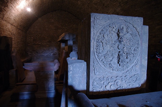 写真3は、棺室の石棺です。ここには遺骨が残されており、これが僖王とされています。石棺の奥、壁にはめられているのが「円形鏤空描金彩釉双龍盤堪」です。