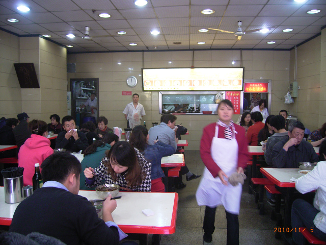写真1は、本店の全景です。入口の右側に立っている男性は呼び込みで、隣の老瓦房でも同様な呼び込みがおり、両店とも声をあげて呼び込みに懸命です。右に座っている女性のところが注文カウンターで、まずここで注文・料金(メニュー料金表は壁に)を払って、自由に空いた席に着くと、間もなく料理が運ばれてきます。