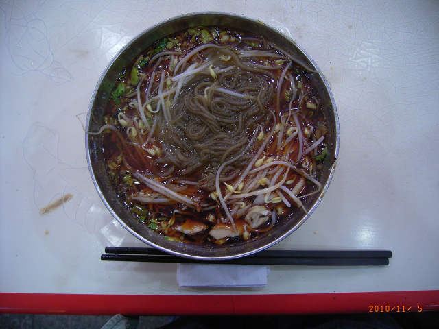 写真2は、「肥腸粉」です。配膳されたものを、粉(麺)が見えるように上のモヤシを少し寄せて撮ったものです。具材は豚のモツとモヤシを主体としたものです。粉はサツマイモのデンプンを主原料として、菜種油・紅辣椒・花椒など混ぜ、自家製造して提供します。この点、保存食の春雨とは異なります。湯(スープ)は豚骨スープが基本です。これに各種の調味料を入れます。私の食したのは基本の「肥腸粉」で、この湯は辣椒・豆瓣醤・花椒・醤油などで調理されたもので、当然ながら四川の麻辣味です。これを肥腸湯といいます。もちろん麻辣味でない、白味のもあります。粉の食感はつるつるとして、軽い歯ごたえがして、春雨のように切れることなくするりと口に入ります。なお、具材や湯味により、仔肺・牛肉・排骨・酸菜肉絲などの各種の肥腸粉があります。「肥腸粉」は8元で、他のも8・7元です。なお、メニューには麺・米線・涼粉などもあります。