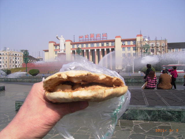 写真4は、この日は成都に珍しく快晴なので、店の南の天府広場に出て食する前に、毛沢東像を背景に撮ったものです。ちょうど、噴水があげられて、雲一つないピーカン天気です。