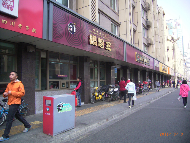 写真1は、店の外観で、ご覧のように隣奥が成都担担麺・総店です(なお、歩道手前にパンダのイラスト入りの箱状のものはゴミ箱です)。総店内のカウンターで食券を求め、店の前に立っている客の所の小さな窓口から店員に食券を渡します。鍋魁の種類は、鍋魁夾鹵肉6元・鍋魁夾耳片6元・鍋魁夾鶏片7元・鍋魁夾青椒肉絲6元・鍋魁夾三4.5元・鍋魁夾頭 絲4.5元・鍋魁夾凉粉4.5元・鍋魁夾瀾肉豇豆5元の8種類です。