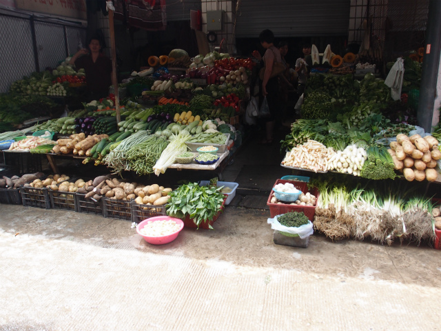 写真2は、蔬菜(野菜)店です。この一角には何軒かの蔬菜店が並んでいます。
