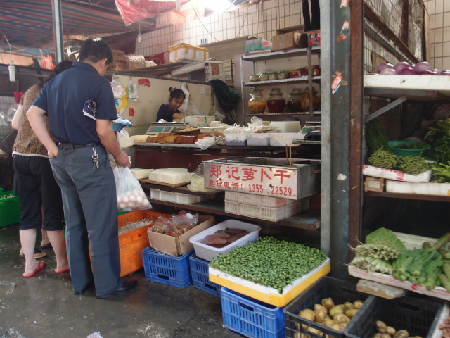 西南大学周辺には四つほどの自由市場(農貿市場)があります。ここで、よく利用している交桂巷農貿市場の様子を写真でお見せします(2012年6月9日土曜休日の午前)。本市場は北門から5分ほどの所にあり、交桂二巷の道の両側に店が並んでいます。回りはマンション団地で、近くにウォルマートがあります。